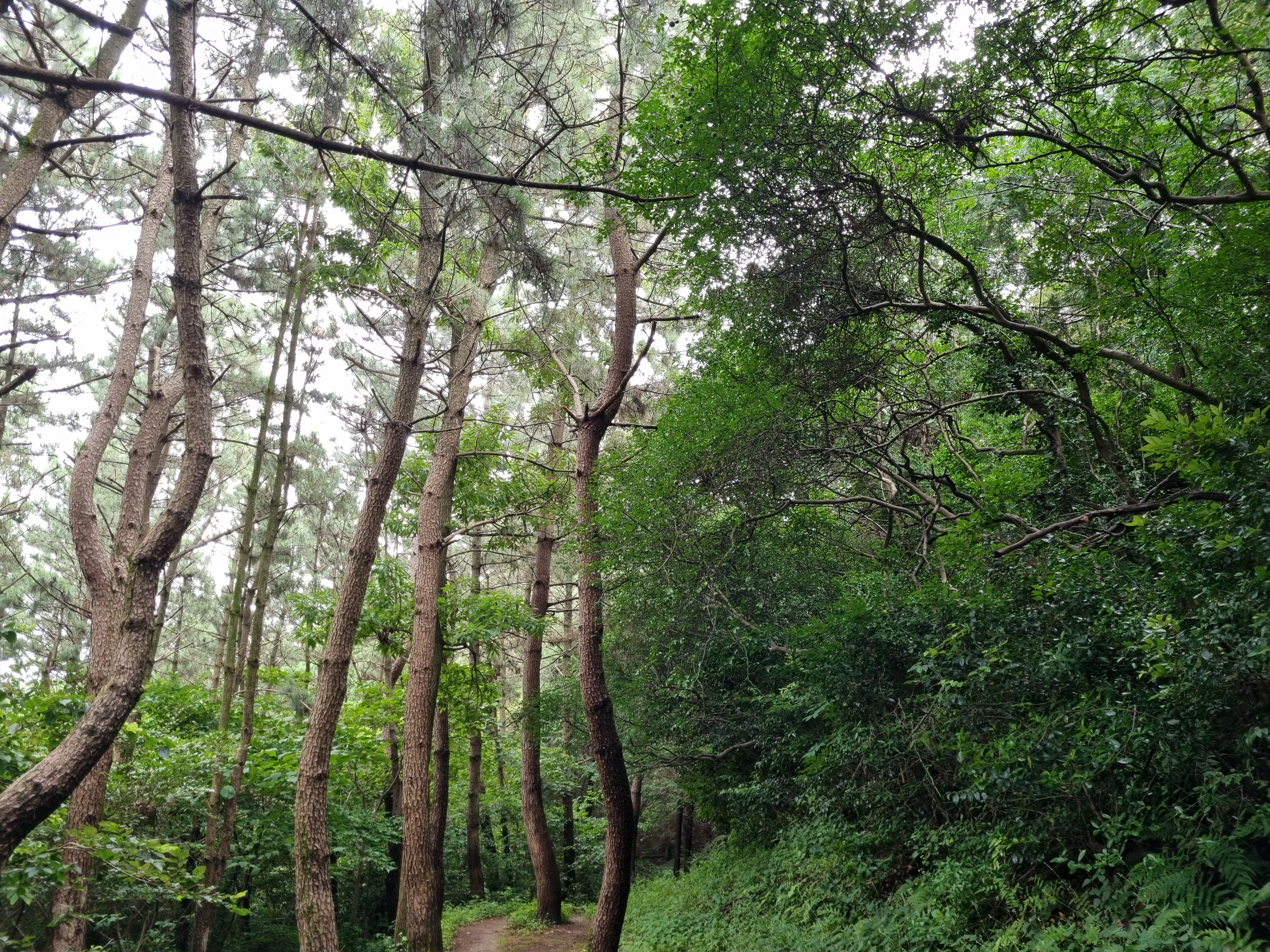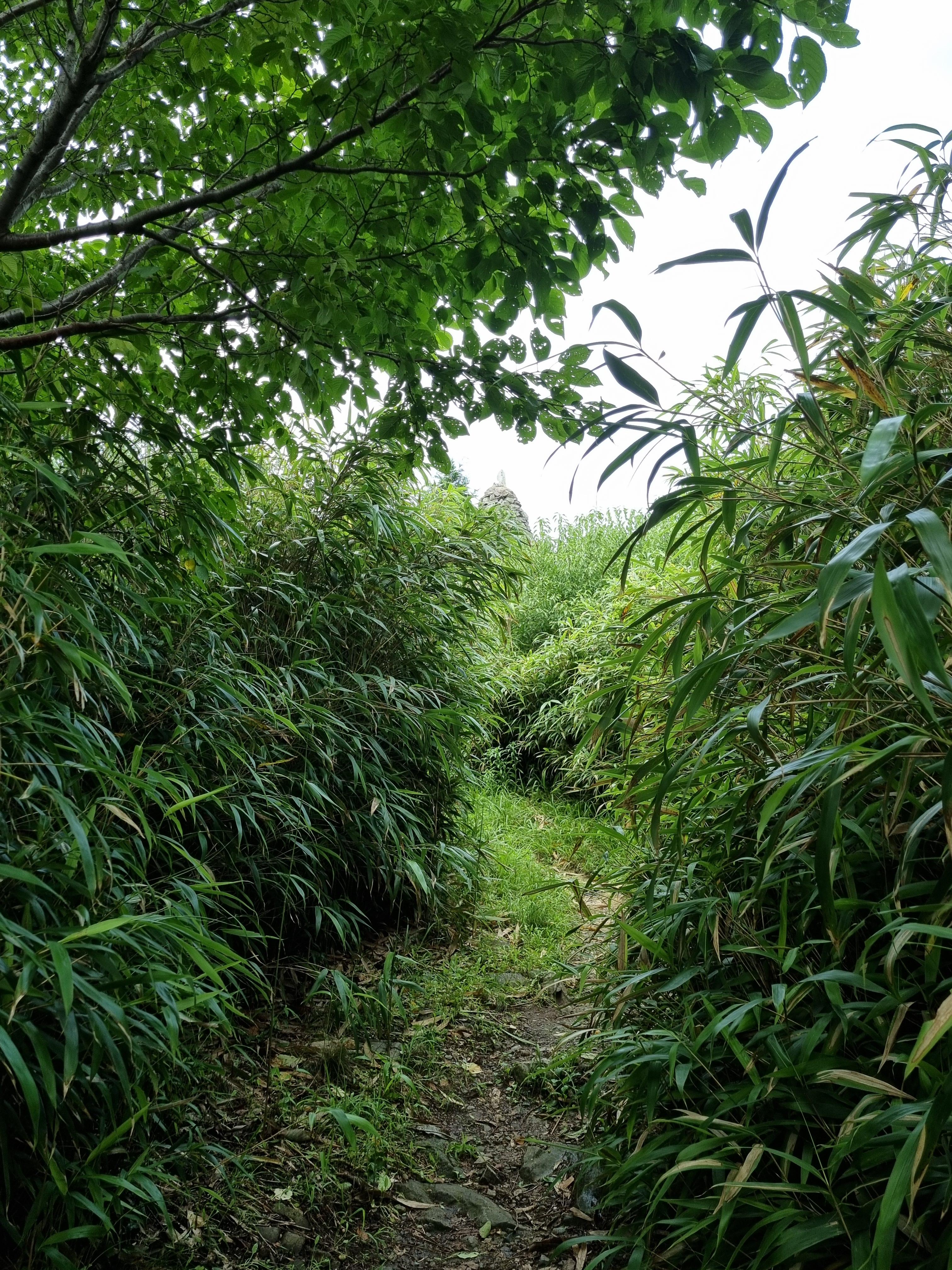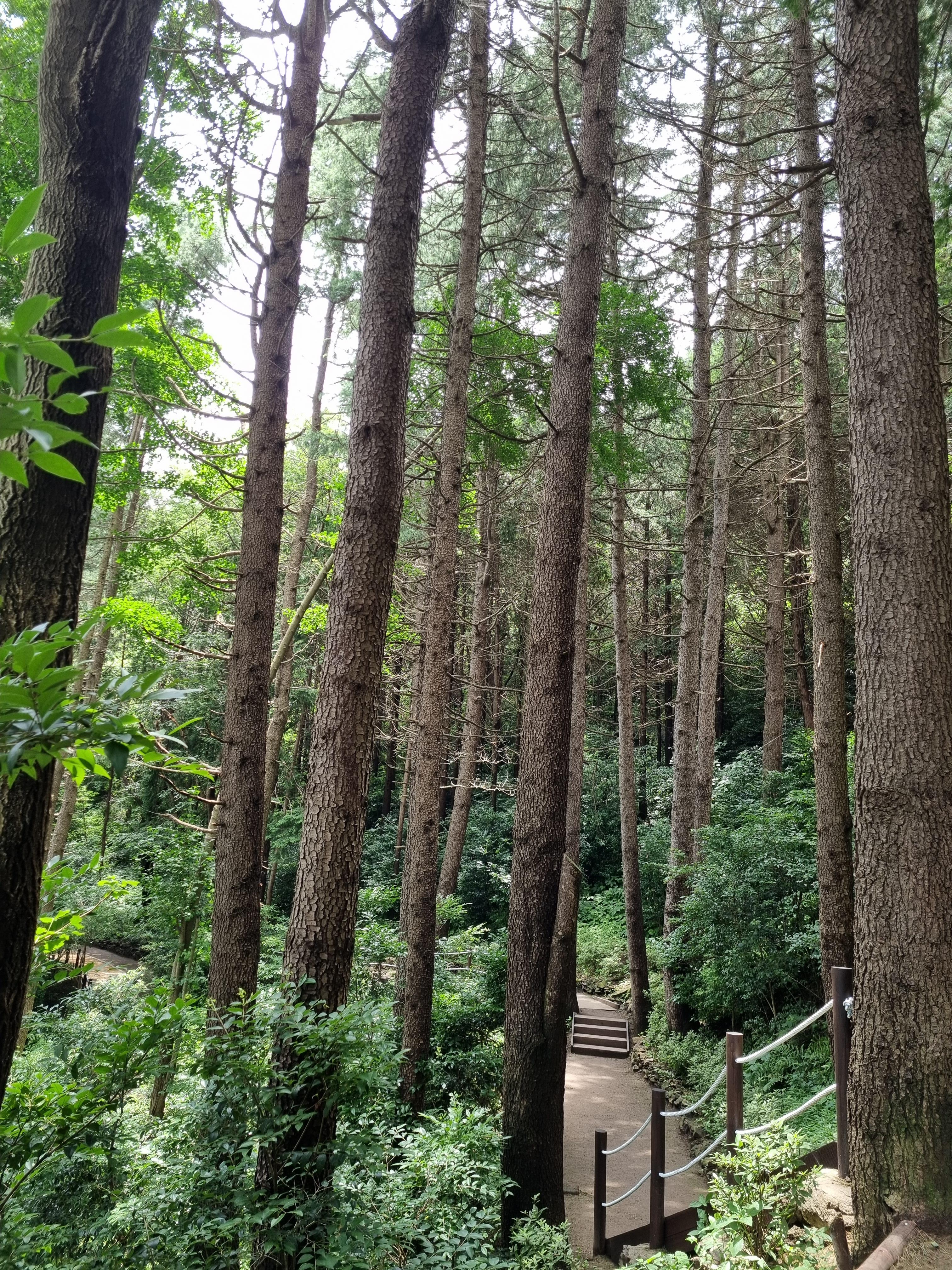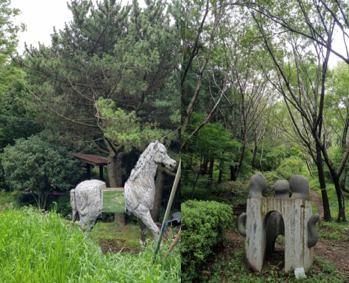 전나무 사이로 바다가 기웃댄다. 나무들의 숨결인지, 안개의 장난인지 숲 바닥은 축축하다. 한 시간쯤 숲의 요정들과 동행하니 조각공원이정표가 나타났다. 근디 이 길은 인적이 묘연한, 수풀이 웃자라고 있어 신경이 곤두섰다. 여태 한사람도 마주치질 못했다. 반시간쯤 헉헉대니 얄궂게도 조각공원은 철조망을 치고 출입금지 표찰을 달았다. 2년 전부터 보수공사로 폐쇄된 셈이었지만 철조망 한 칸은 뚫린 채다. 조각공원과 정상을 어찌 가나? 서성대고 있는데 공원보수공사를 하는 트럭이 나타나 하소연 했다. 들어와서 반대편철조망 밖에서 우측 산길을 오르란다.