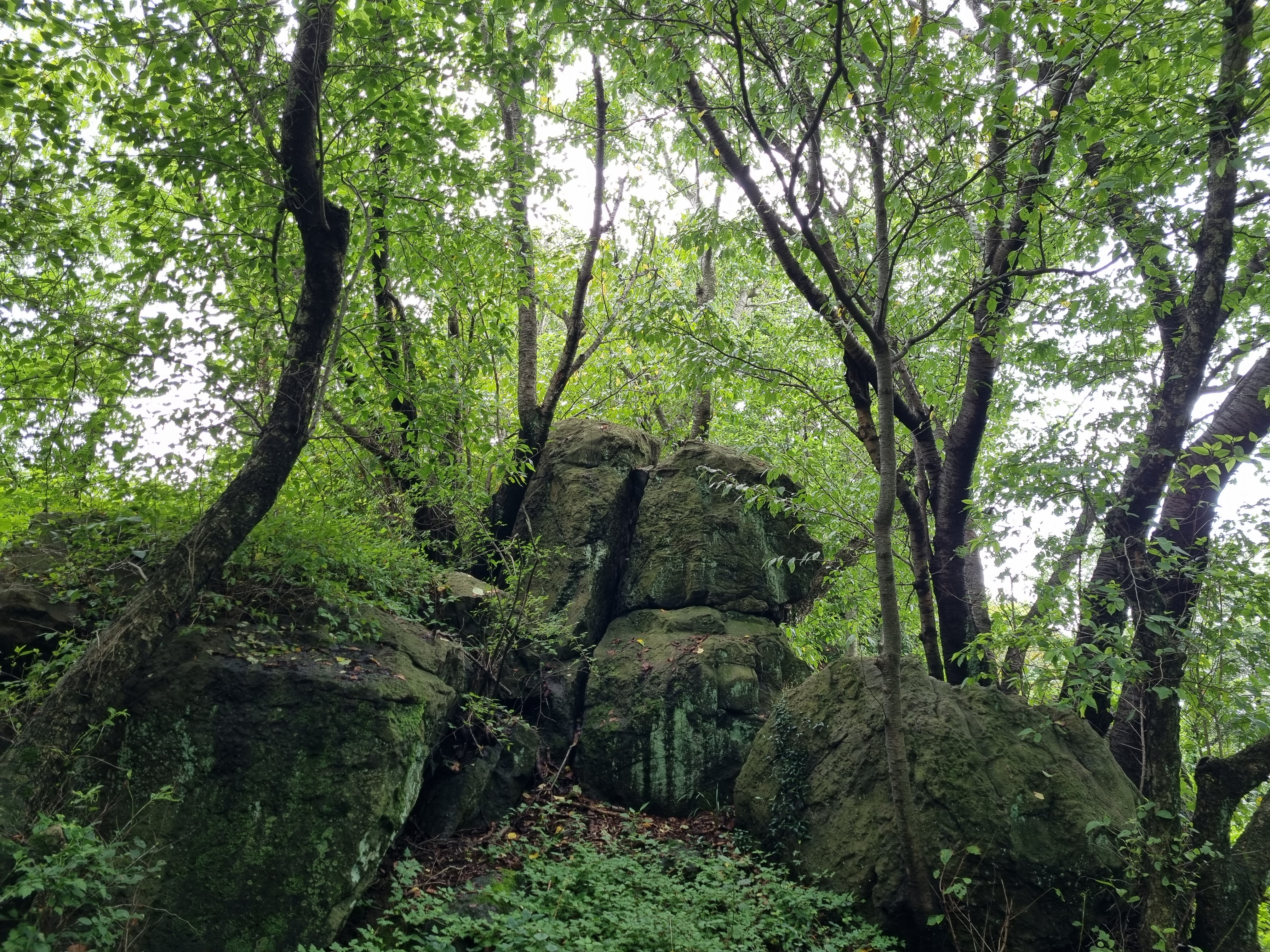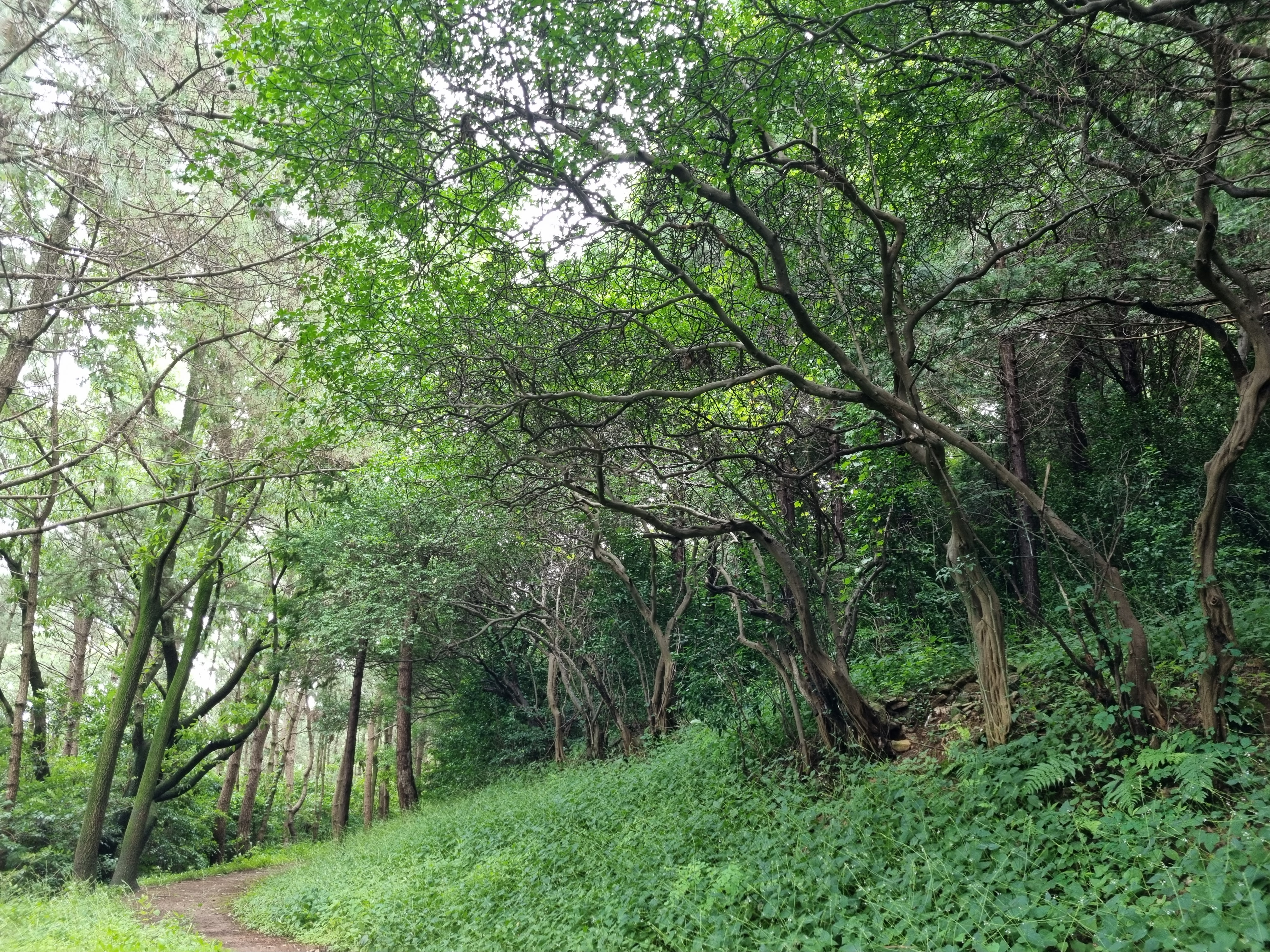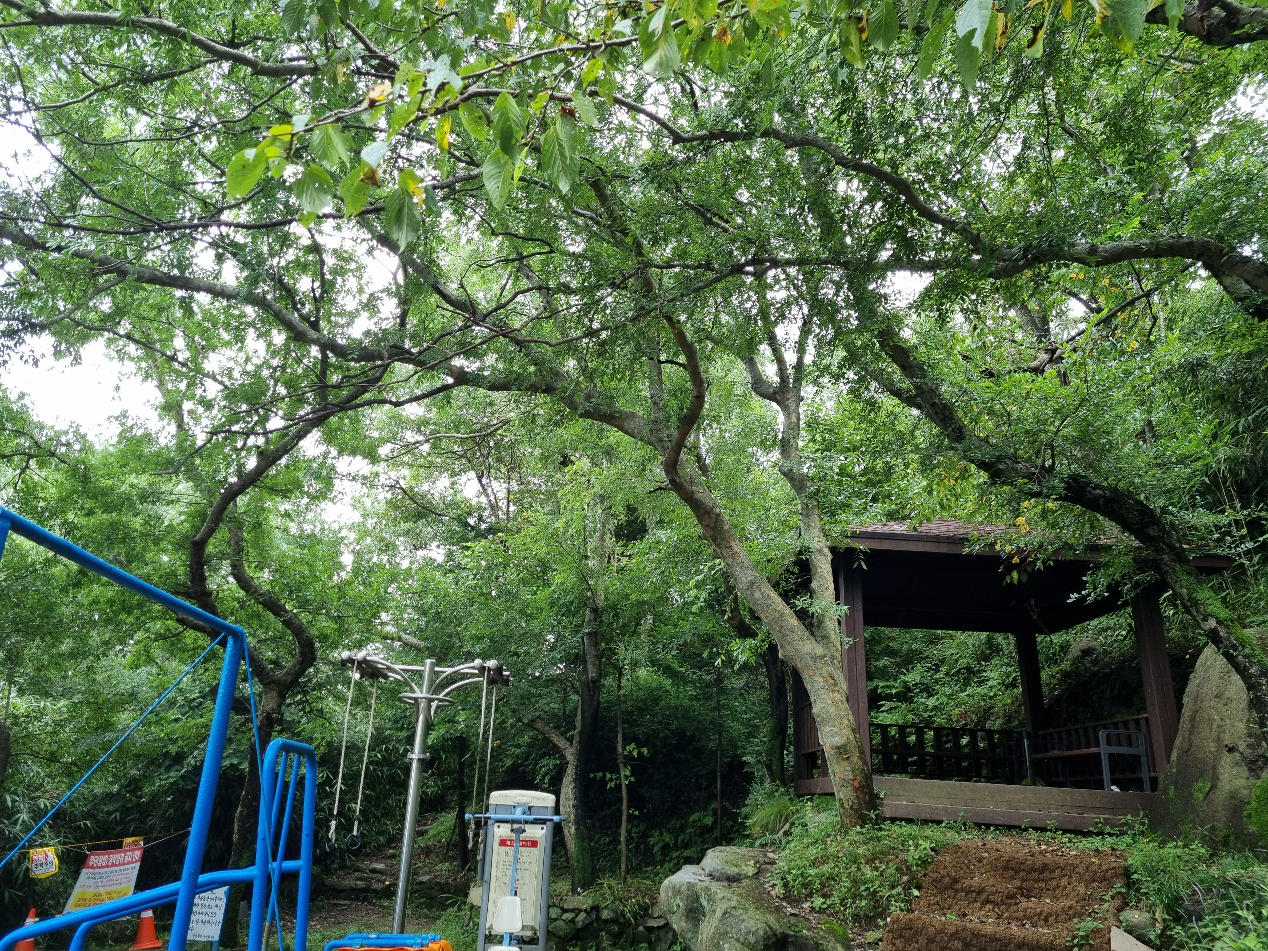 전나무 사이로 바다가 기웃댄다. 나무들의 숨결인지, 안개의 장난인지 숲 바닥은 축축하다. 한 시간쯤 숲의 요정들과 동행하니 조각공원이정표가 나타났다. 근디 이 길은 인적이 묘연한, 수풀이 웃자라고 있어 신경이 곤두섰다. 여태 한사람도 마주치질 못했다. 반시간쯤 헉헉대니 얄궂게도 조각공원은 철조망을 치고 출입금지 표찰을 달았다. 2년 전부터 보수공사로 폐쇄된 셈이었지만 철조망 한 칸은 뚫린 채다. 조각공원과 정상을 어찌 가나? 서성대고 있는데 공원보수공사를 하는 트럭이 나타나 하소연 했다. 들어와서 반대편철조망 밖에서 우측 산길을 오르란다.