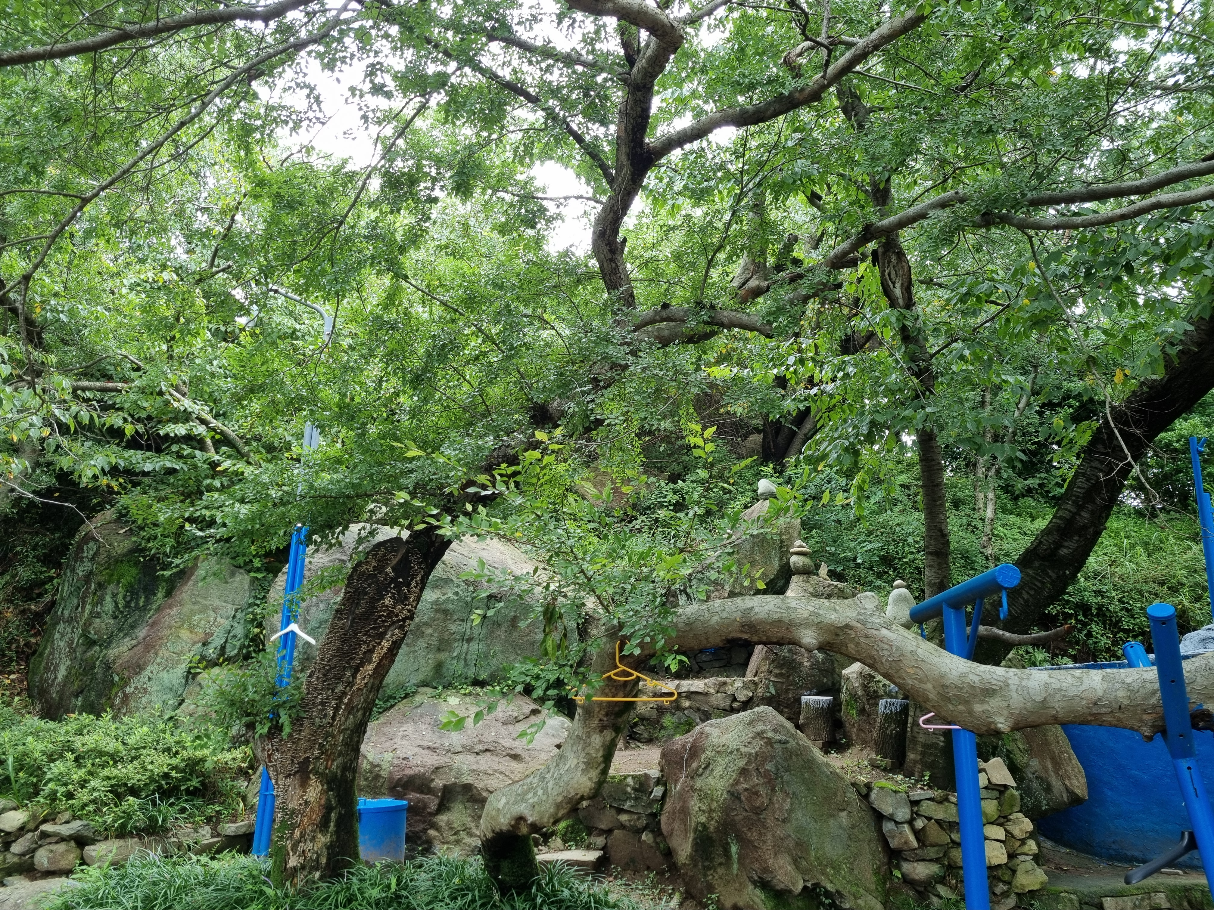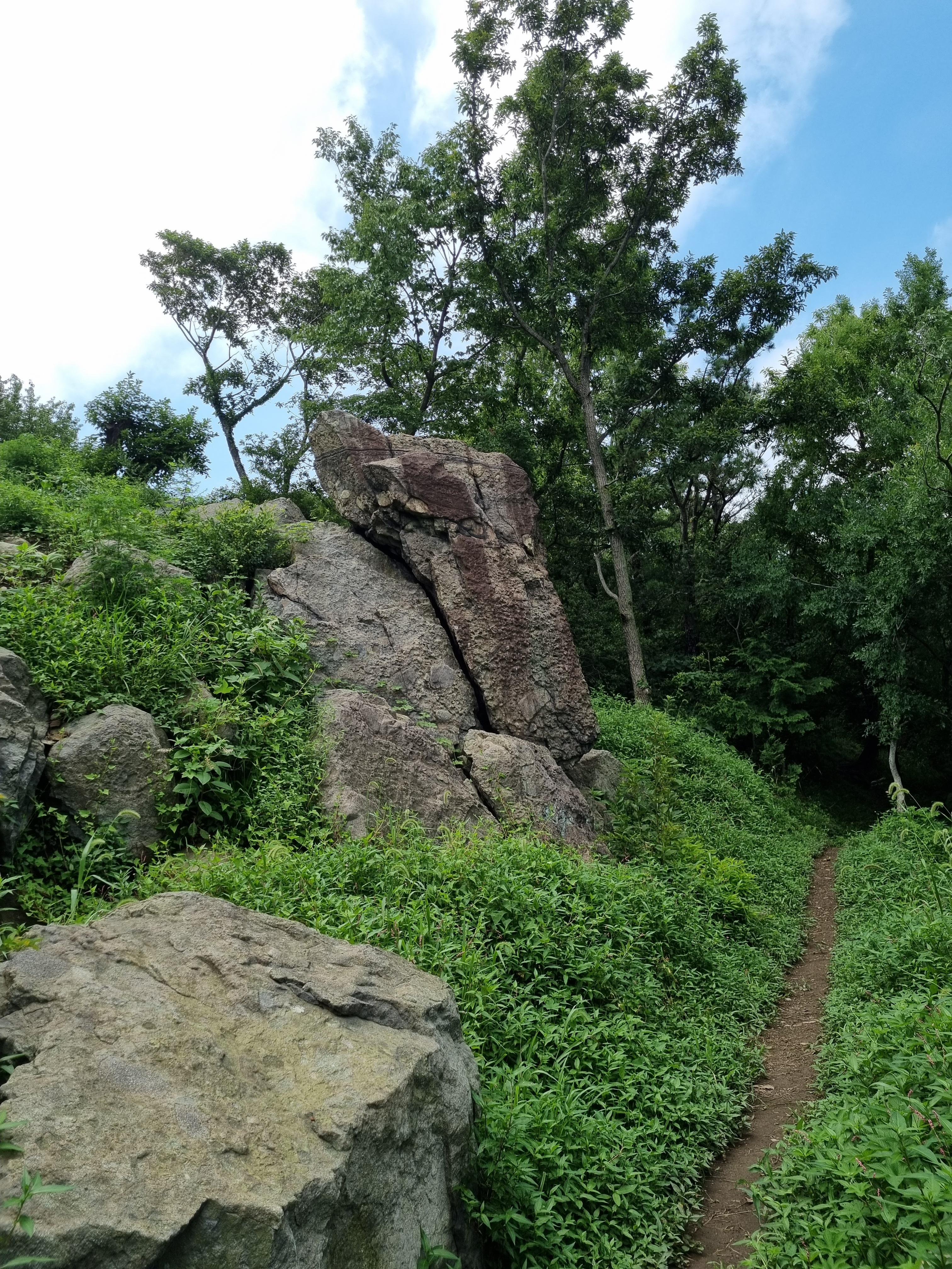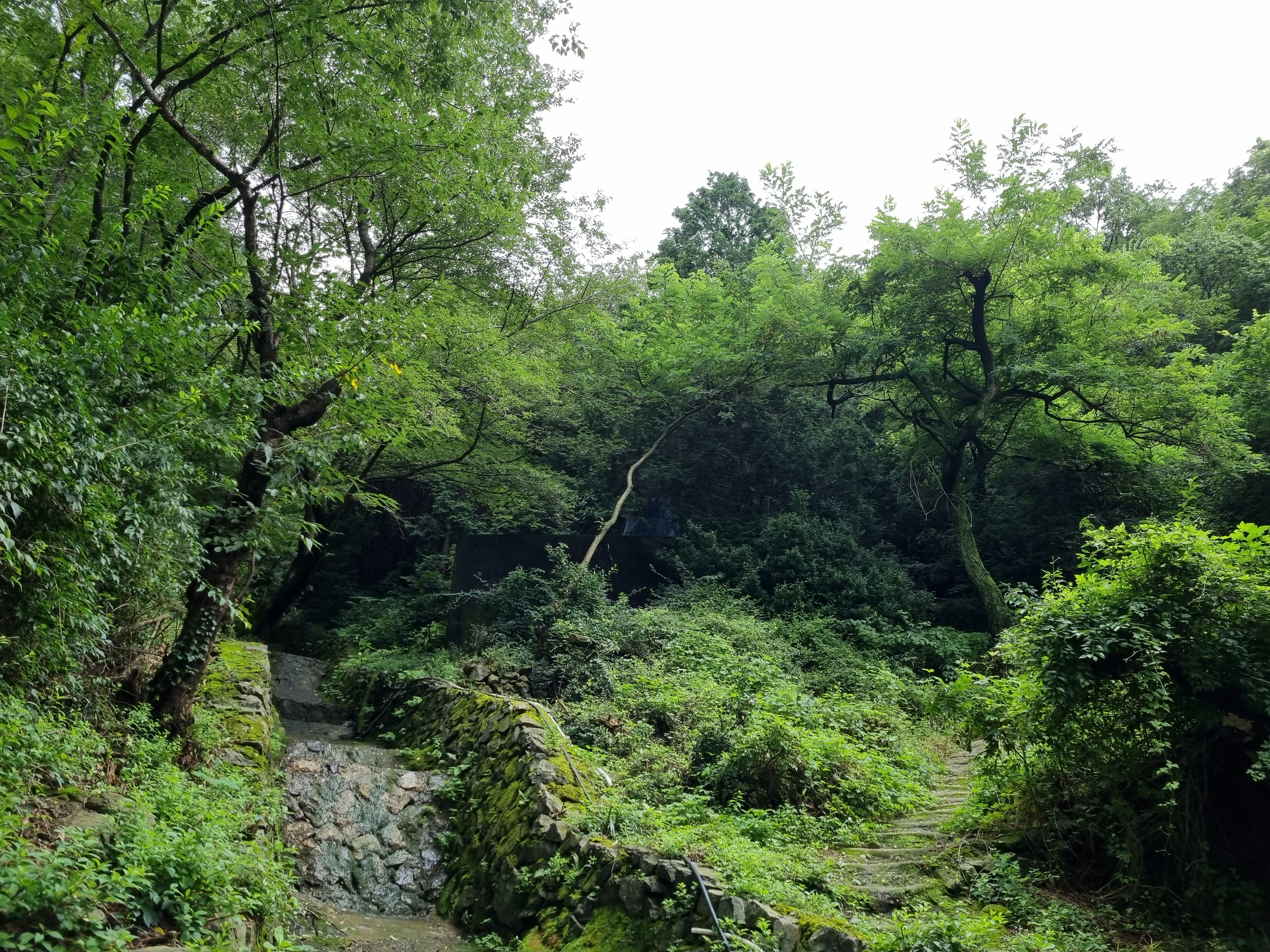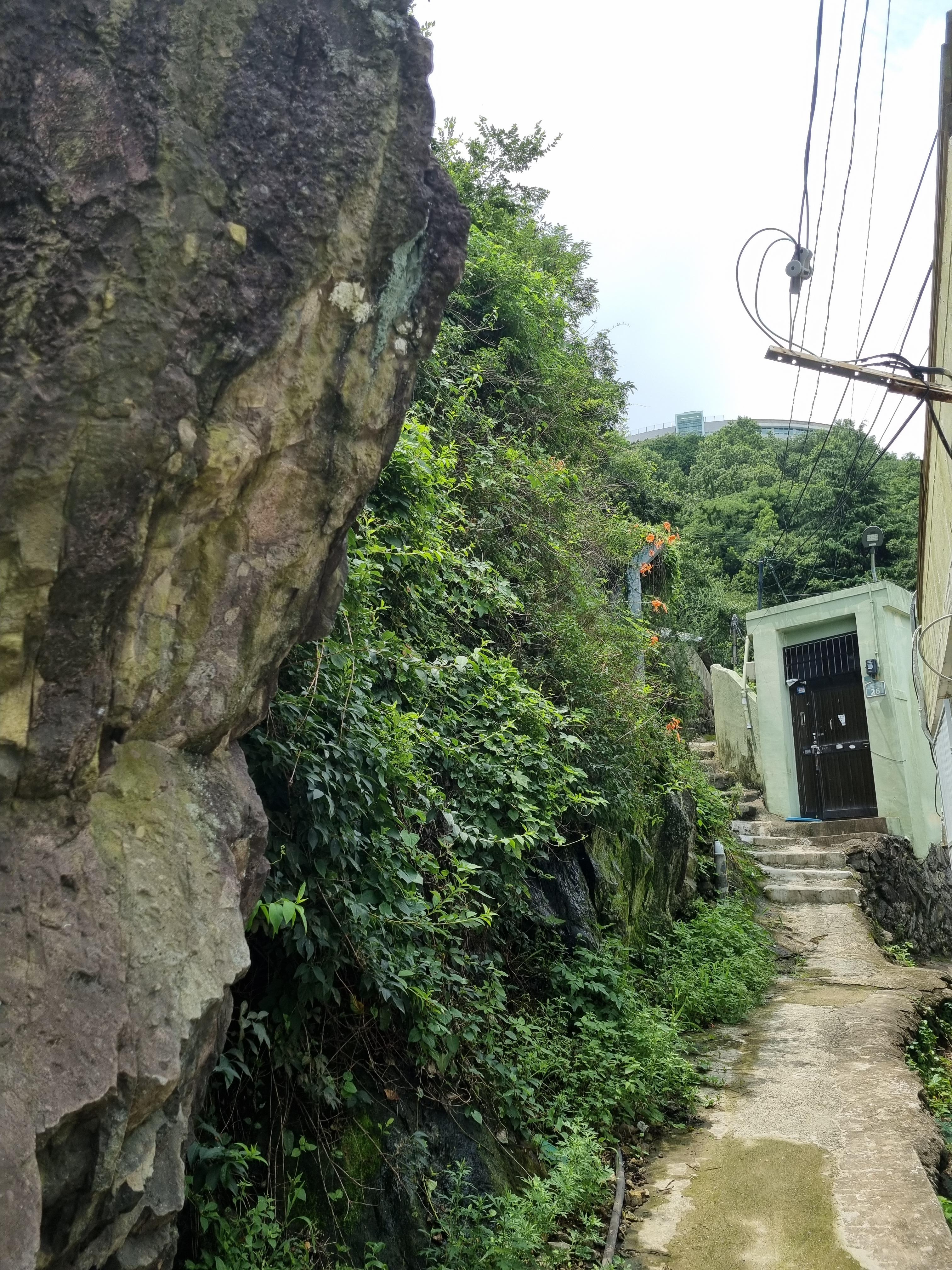 장마전선의 국지성폭우로 전국이 난리인데 부산지방은 찌푸린 채 비 올 생각은 접고 꾸무럭대기만 한다. 땡볕 걱정은 안 해도 될 성싶어 천마산행에 나섰다. 사흘 전 감천문화마을 소요 때 검푸른 천마산이 허리춤에 걸친 알록달록한 카드섹션치마 속살이 궁금했었다. 토성역을 나서 까치고개 감천문화마을을 향하다 아미초등학교 옆 구멍가게 주인장께 천마산등산 지름길을 물었다. 바로 옆 골목길로 쭉 올라가란다. 보아하니 골목 같지도 않다. 두 사람이 겨우 비켜갈 만한 가파른 시멘트계단을 뱀처럼 기어올라야 했다.