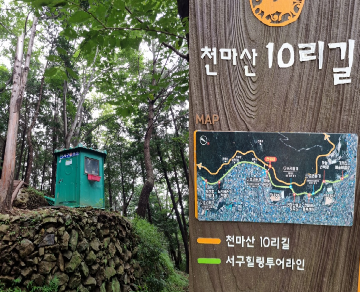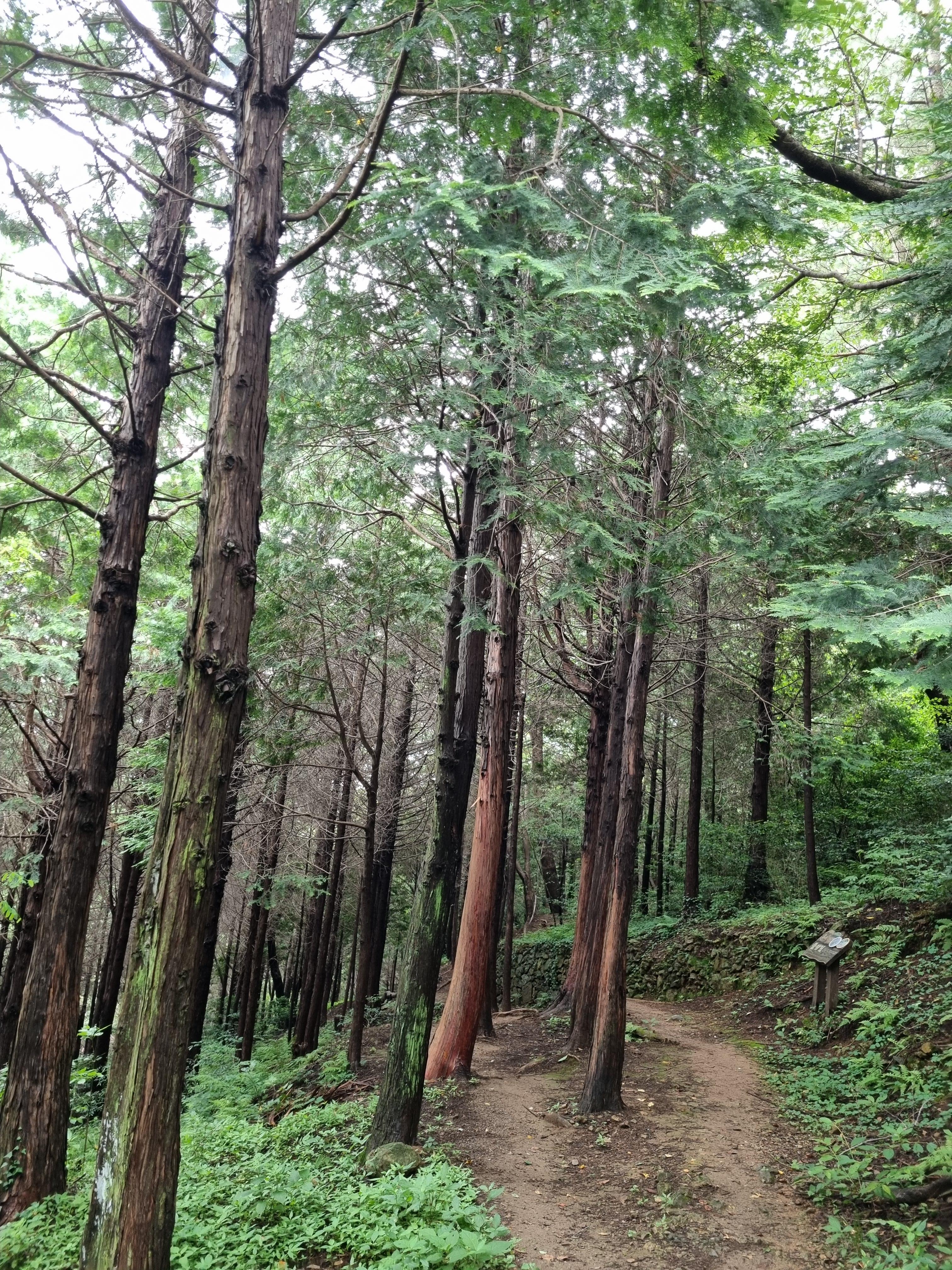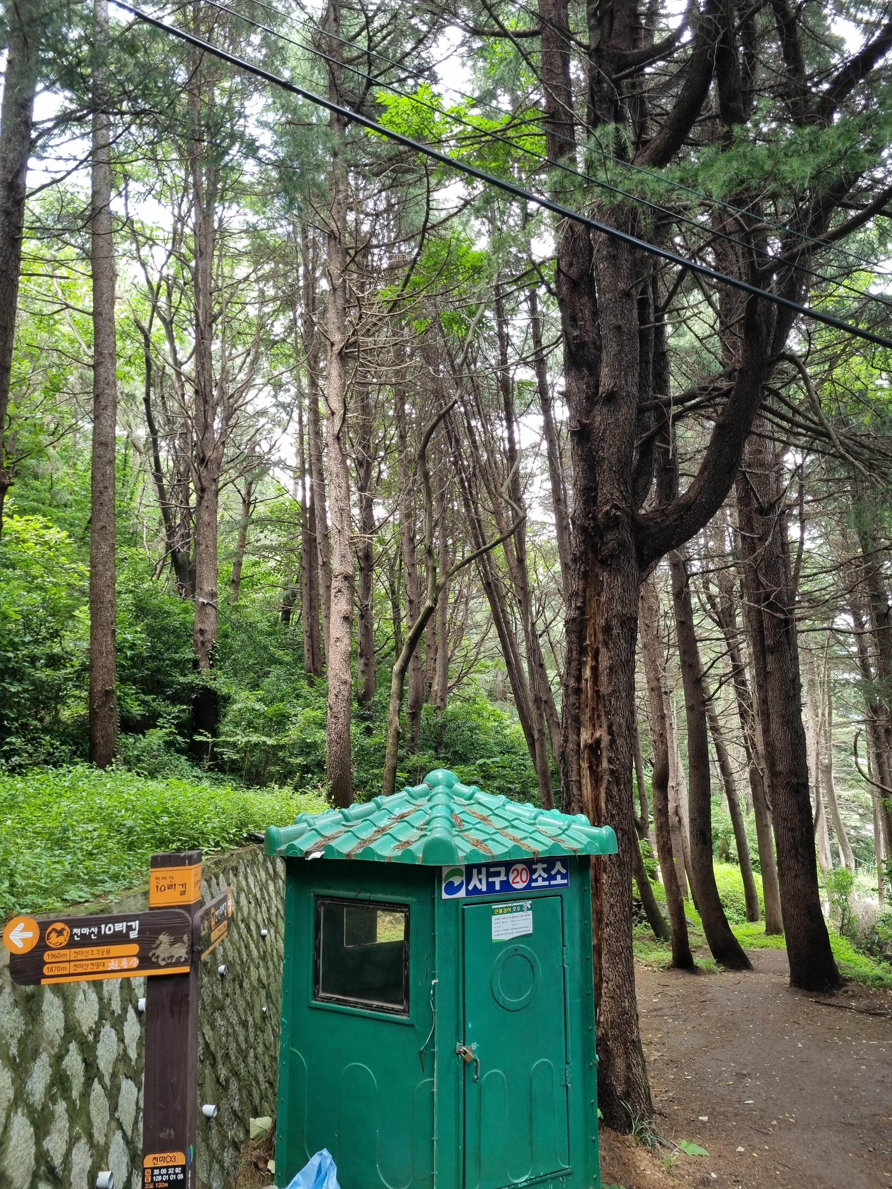 감천문화마을 골목길은 어떻게든 이어진다는 요지경 아닌 기똥참을 이미 터득한 탓에 숨 헐떡거리며 여수같이 헤맸다. 훤한 임도가 나왔지만 급살 맞게 경사진 골짝물길 좇는 숲속산길을 헤쳐 올랐다. 천마산십리길이 나타났다. 긴장이 풀렸다. 고요하고 산뜻한 숲길이 보상하듯 이어진다. 울창한 삼나무 숲속에 탱자나무길, 담장 길, 쥐똥나무길 등 명찰을 달아 놨다. 음습해선지 초소도 있다. 환장하게 멋지다. 이 멋진 숲길에, 치유의 숲길에 왜 인적이 없을까? 고것이 궁금하기도 했다. 전나무가 하늘을 찌를까봐 회색구름이 장막을 쳤다.