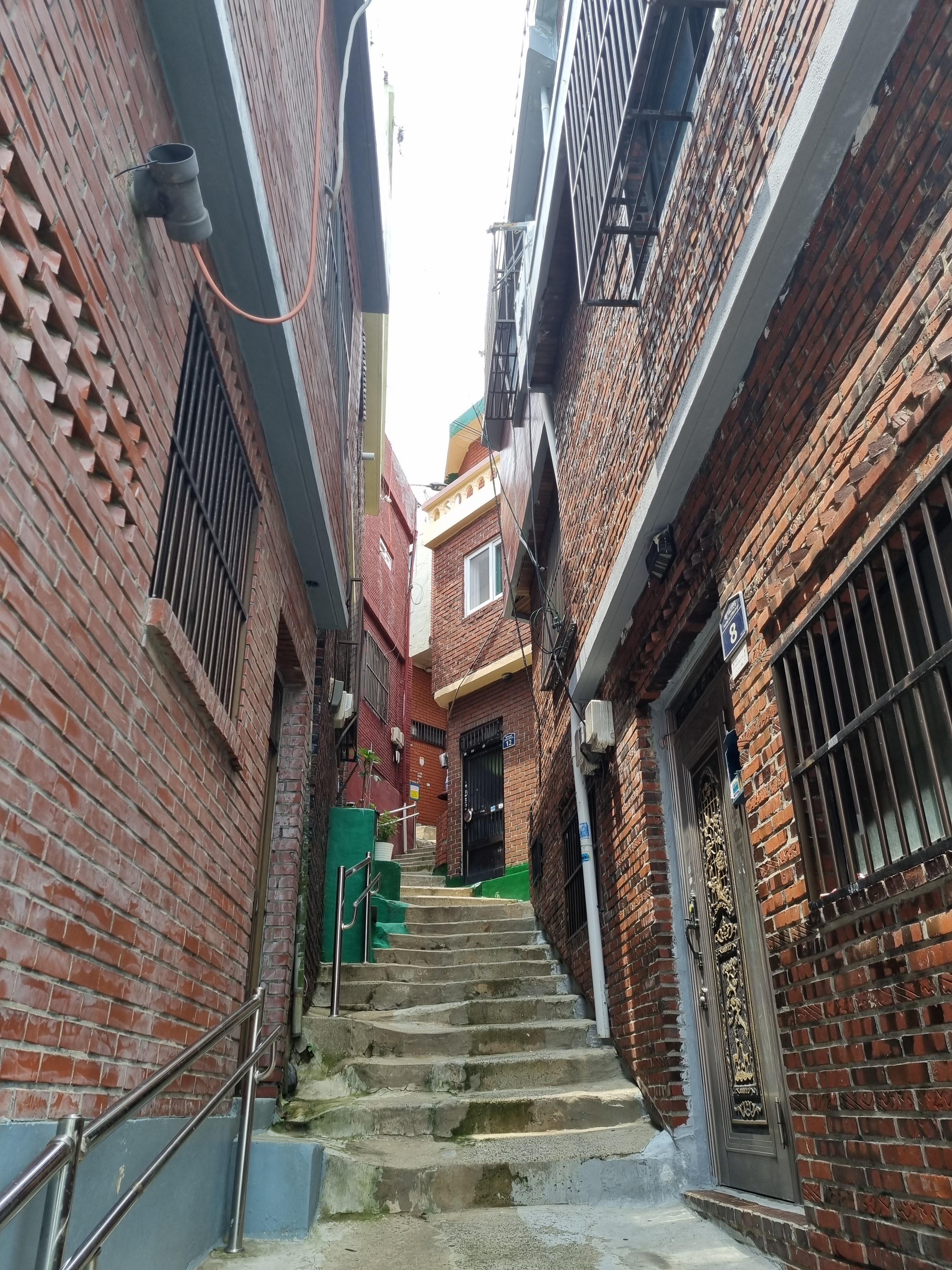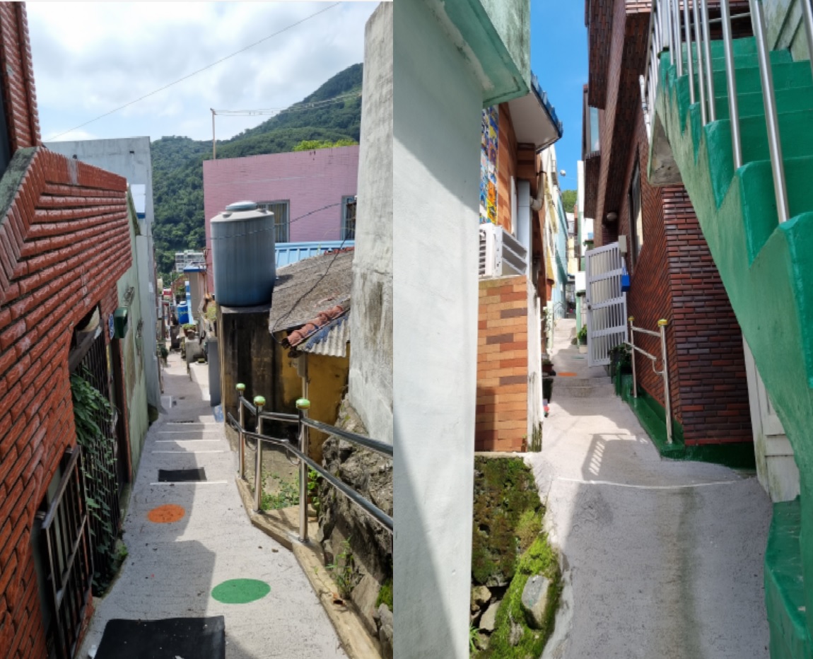 길은 요리저리 얽혀 한참을 미로 찾기 한다. 6.25피난민들이 피곤한 삭신을 붙인 움막들이 기차 칸처럼 붙어있다. 비탈에 바짝 엎드린 집들은 70여년의 애환의 세월을 관통한 유대감을 과시하듯 고만고만 엇비슷하다. 그들은 설음과 기쁨을 원색 칠로 표현하며 위안 삼았지 싶었다. 나 역시 북아현동 달동네에서 70년대를 뭉그적댔던 애환이 반추됐다. 한밤중에만 찔끔찔끔 나온 수돗물, 두세대식구가 공동변소 사용할 눈치싸움 끝의 배설의 쾌감(?)이 주마등처럼 스친다. 그때가 결코 불행하단 생각을 안 했다.