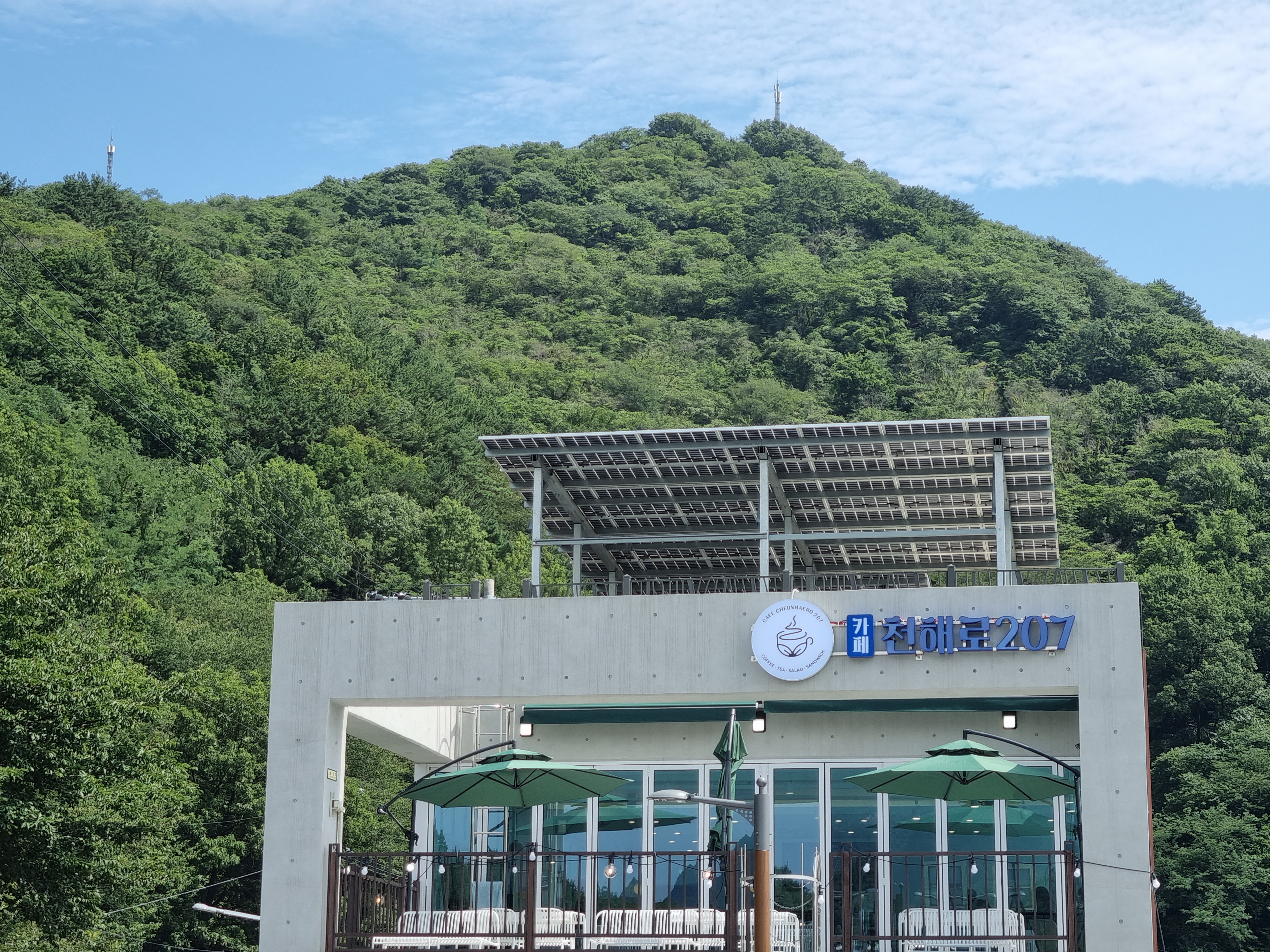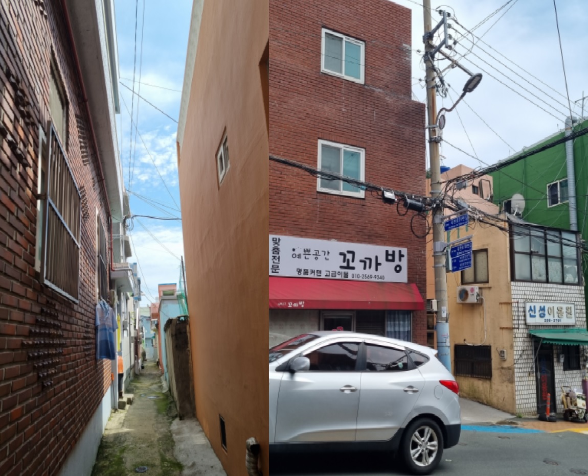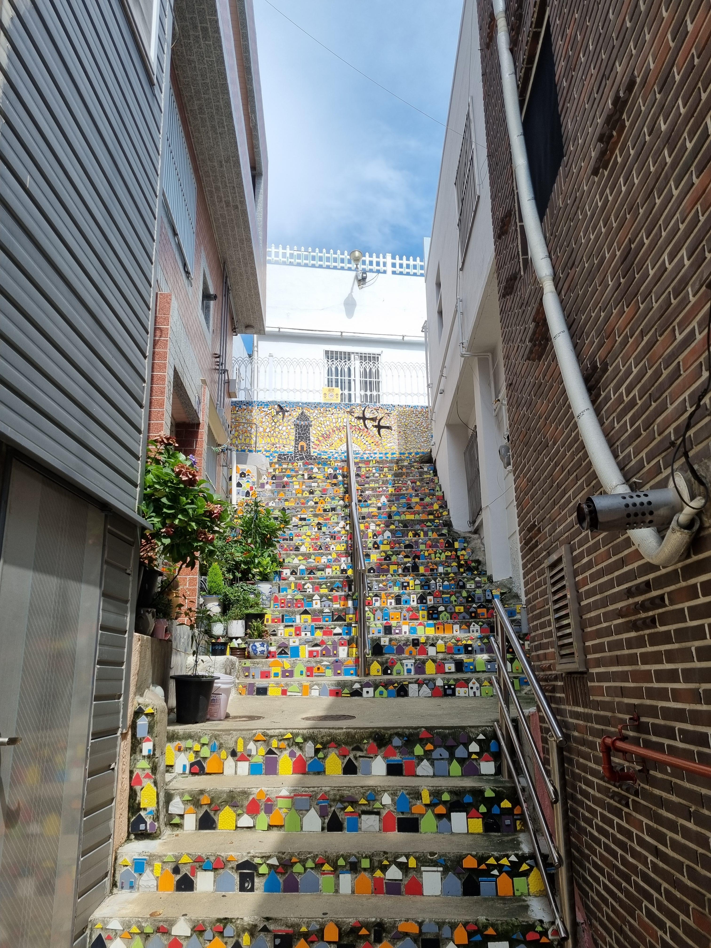 정상에선 감천문화마을과 비석마을, 송도해수욕장, 다대포와 낙동강, 대마도까지도 볼 수가 있다. 그저께 탐방했던 감천문화마을이 좌측 산골짝에서 카드섹션을 벌리고 있다. 하산하면서 천마산이 허리춤까지 두르고 있는 울긋불긋한 원색치마 속을 들여다보며 감천문화마을로 빠져들 참이다. 감천문화마을에서 가장 높은 영동힐타운을 향하는 하산 길은 허발 나게 깔크막졌다. 카페천해로207가 있는 산복도로에 섰다. 그 아래 산비탈 골목길이 감천문화마을로 이어질 터여서 비좁고 급살 맞게 경사진 골목계단을 내려 밟는다.