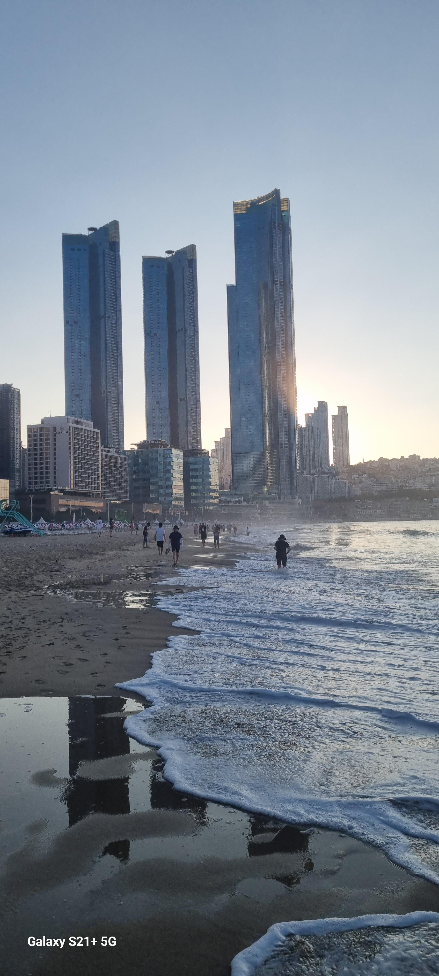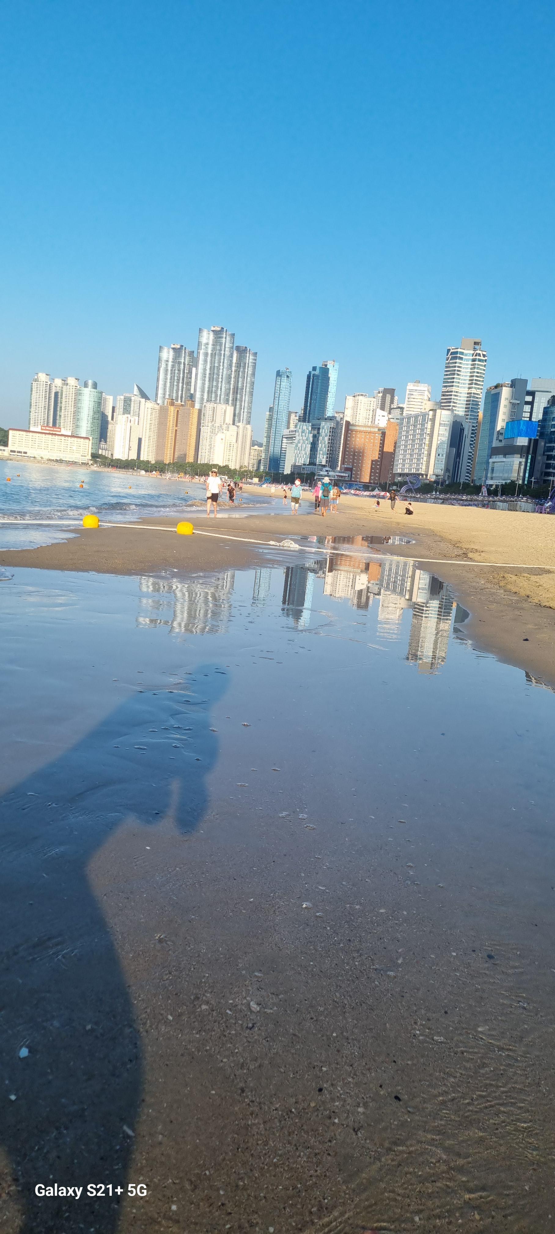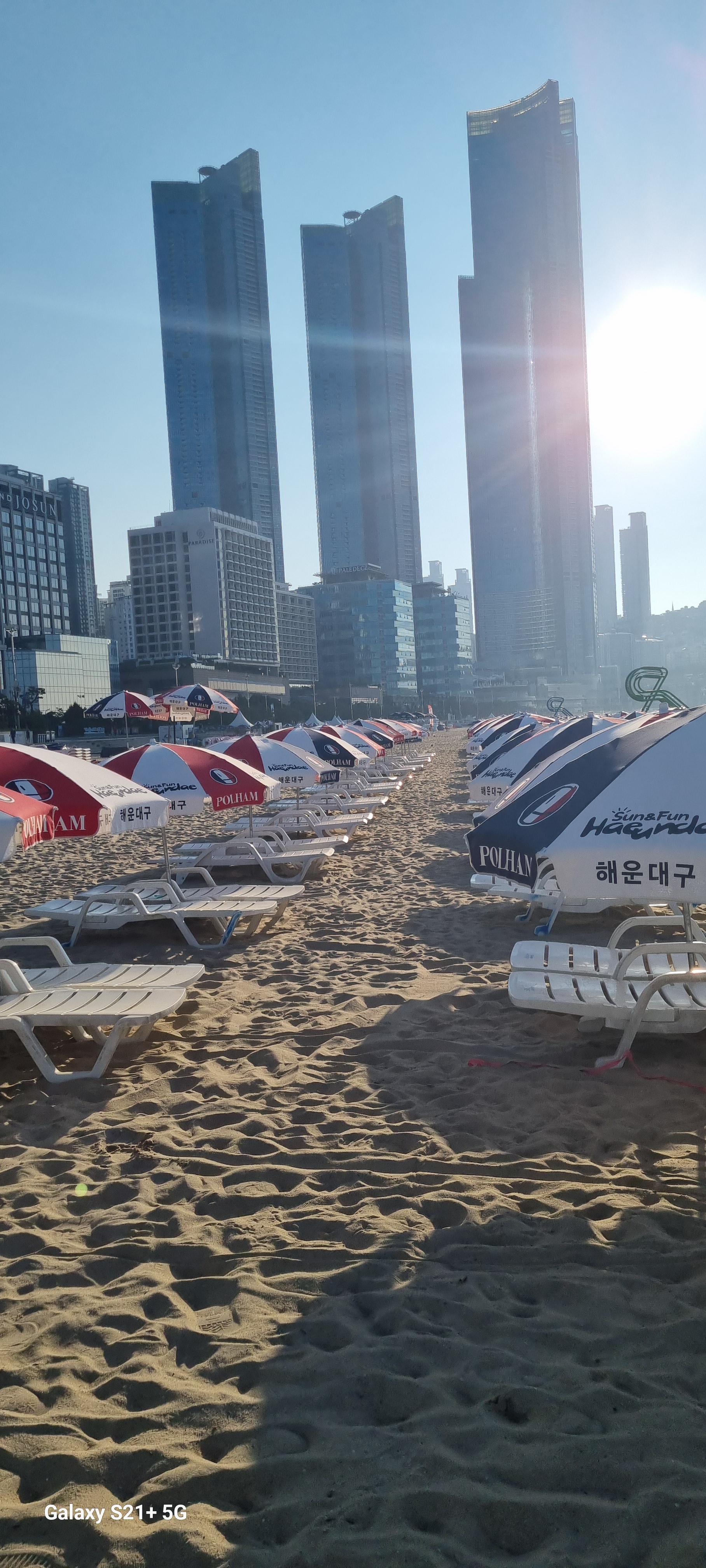 # 위 그림은 해운대해수욕장 한낮 풍경 2장 외 모두 아침6시경의 풍경이다. 백사장길이는 1.5mk남짓으로 새벽녘과 석양엔 백사장 맨발트레킹족들의 경연장(?)인듯 싶다. 필자도 땡볕을 피해 지금은 새벽 백사장맨발 트레킹(왕복2회 6km)에 나섰다