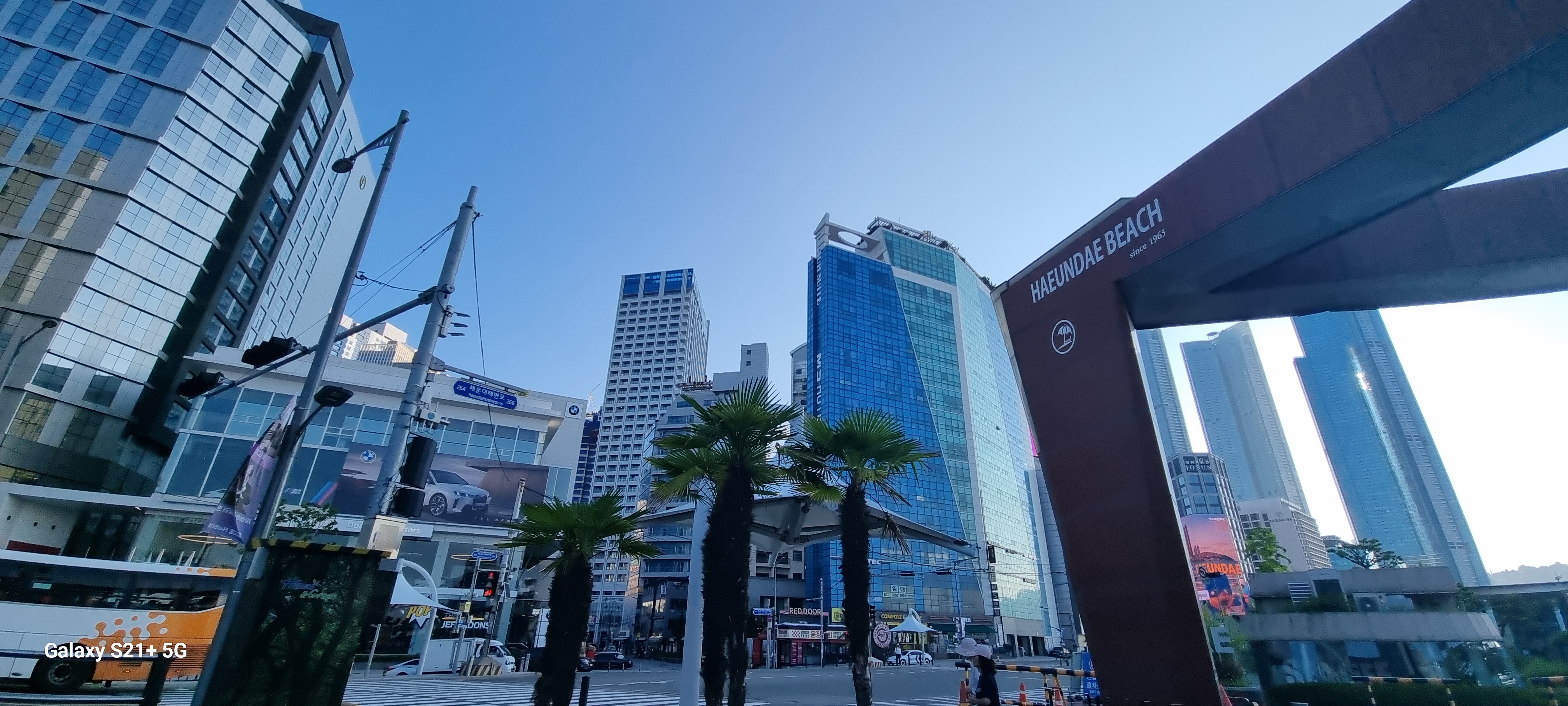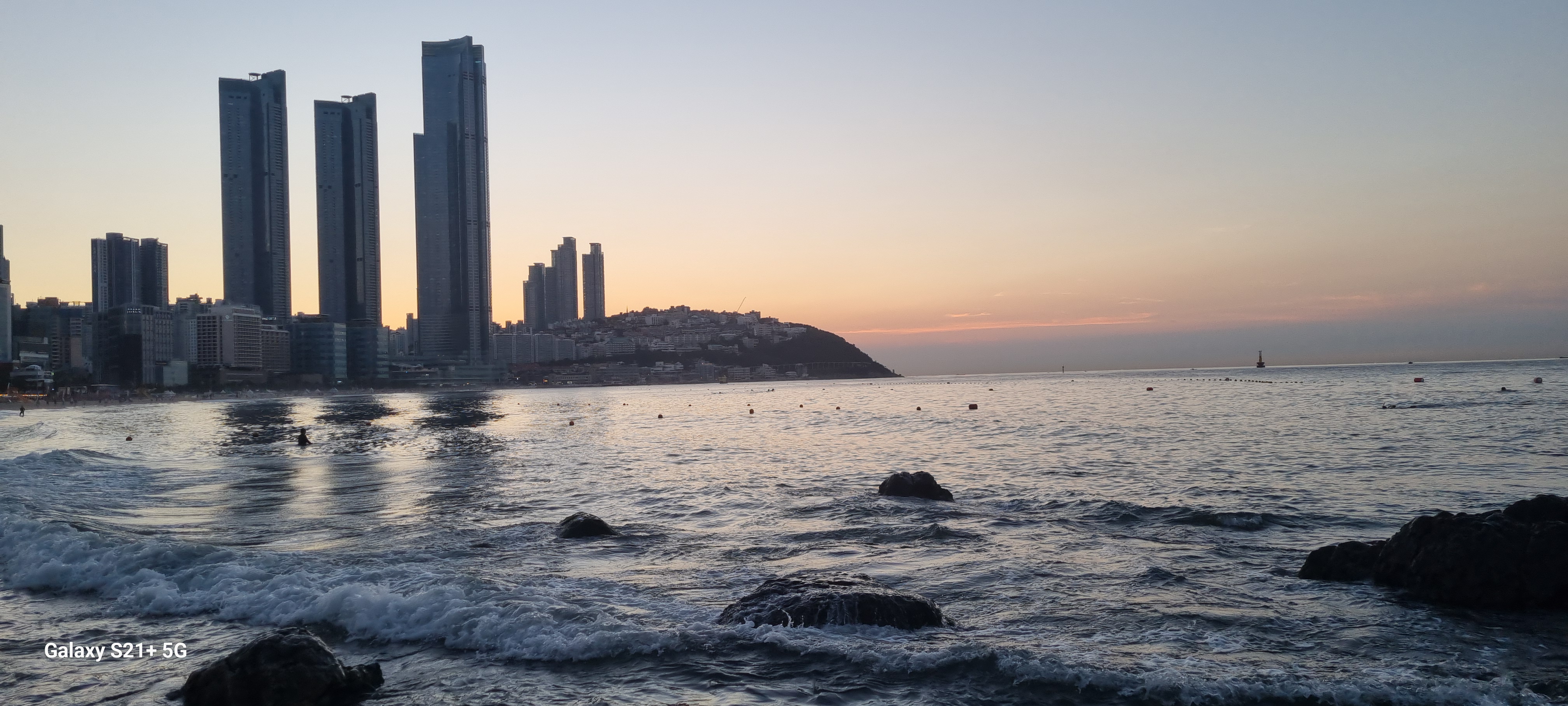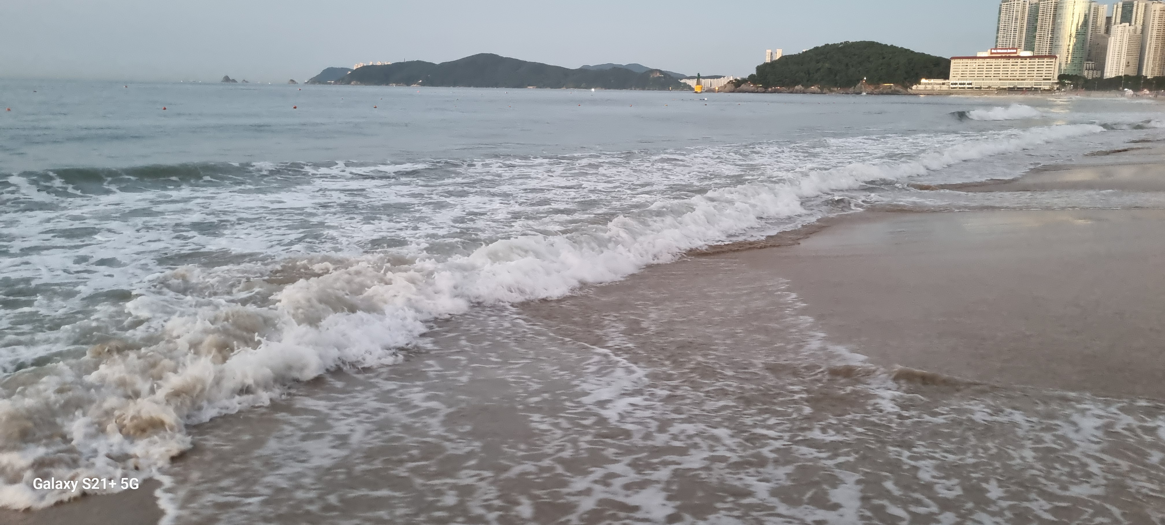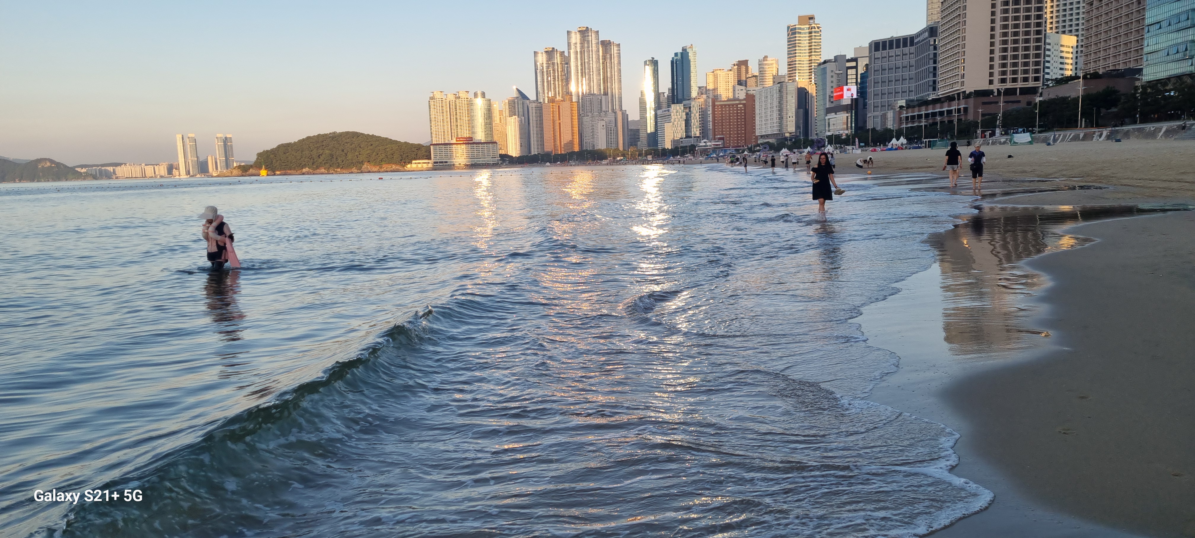 # 위 그림은 해운대해수욕장 한낮 풍경 2장 외 모두 아침6시경의 풍경이다. 백사장길이는 1.5mk남짓으로 새벽녘과 석양엔 백사장 맨발트레킹족들의 경연장(?)인듯 싶다. 필자도 땡볕을 피해 지금은 새벽 백사장맨발 트레킹(왕복2회 6km)에 나섰다