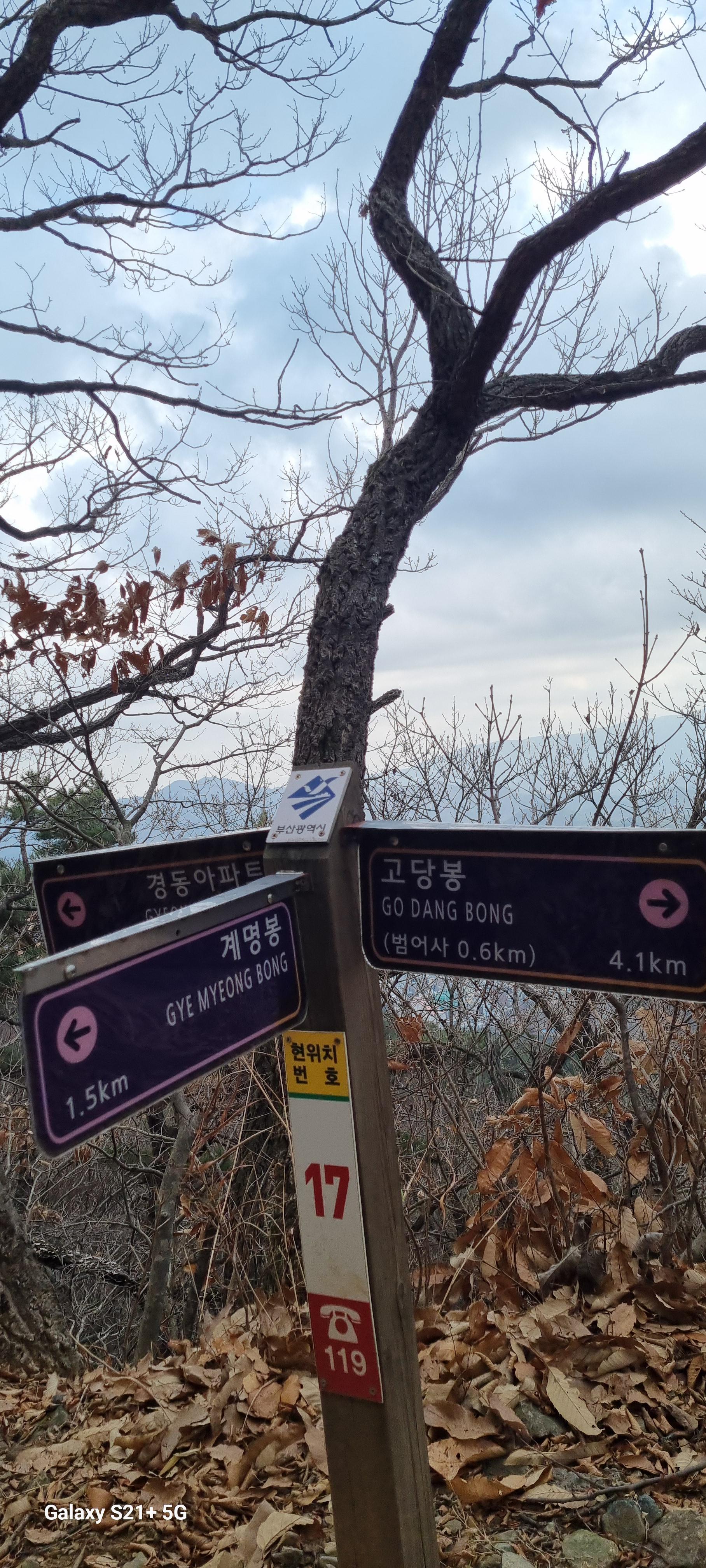 계명봉은 동네 뒷산 봉우리 같았다. 옛날엔 봉수대가 있었다는데 바위산정에 소나무와 푯말이 반색할 뿐이었다. 다만 우측 산자락에 범어사가 명료하게 다가섰고, 금정산 고명봉도 형체가 또렷하며 부산시가지와 부산컨트리클럽이 발아래 펼쳐진다. 천여년 전 의상대사도 범어사-계명봉-장군봉-고담봉코스를 소요했을 테다. 불원간 나도 이 코스의 스님행적을 좇아가고 싶다. 흐뭇한 트레킹이었다. 2025. 12. 20