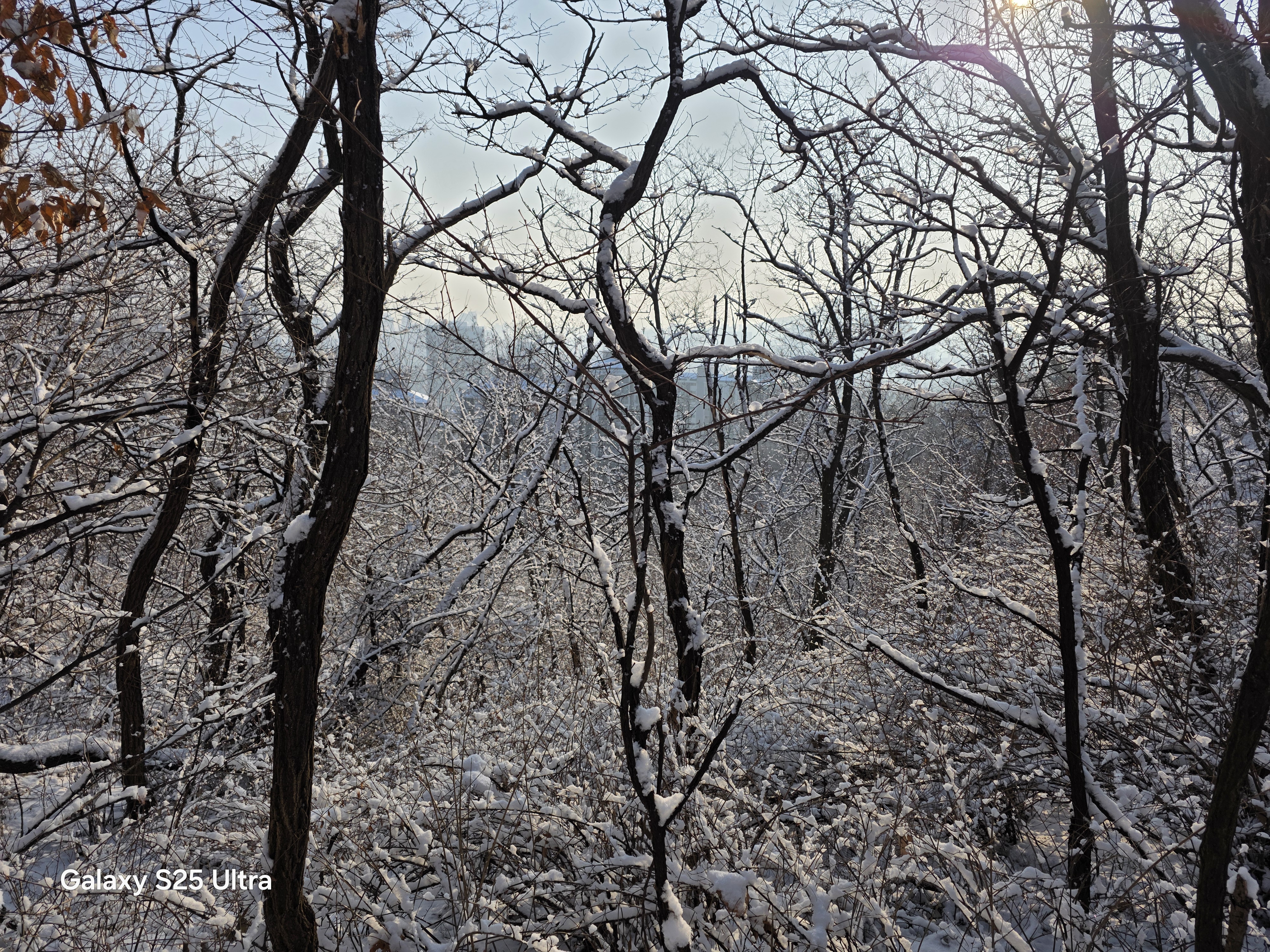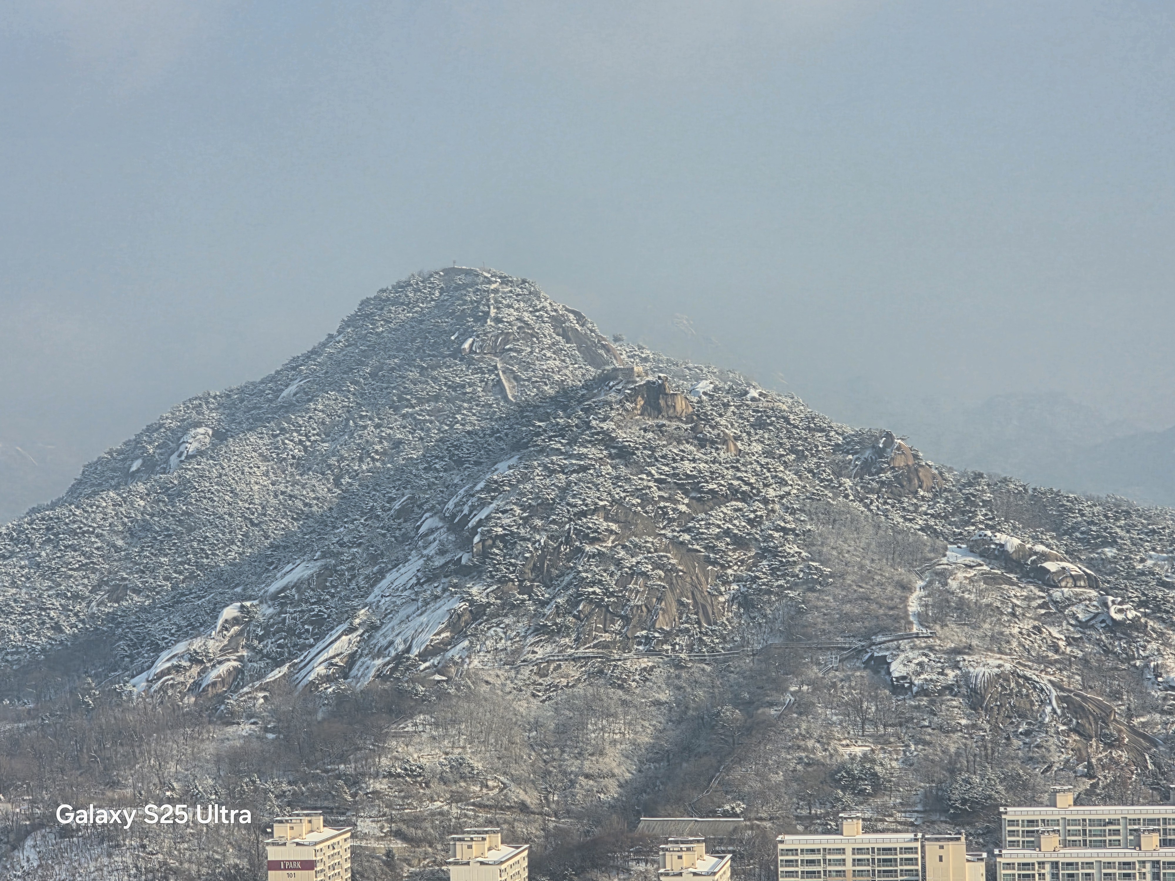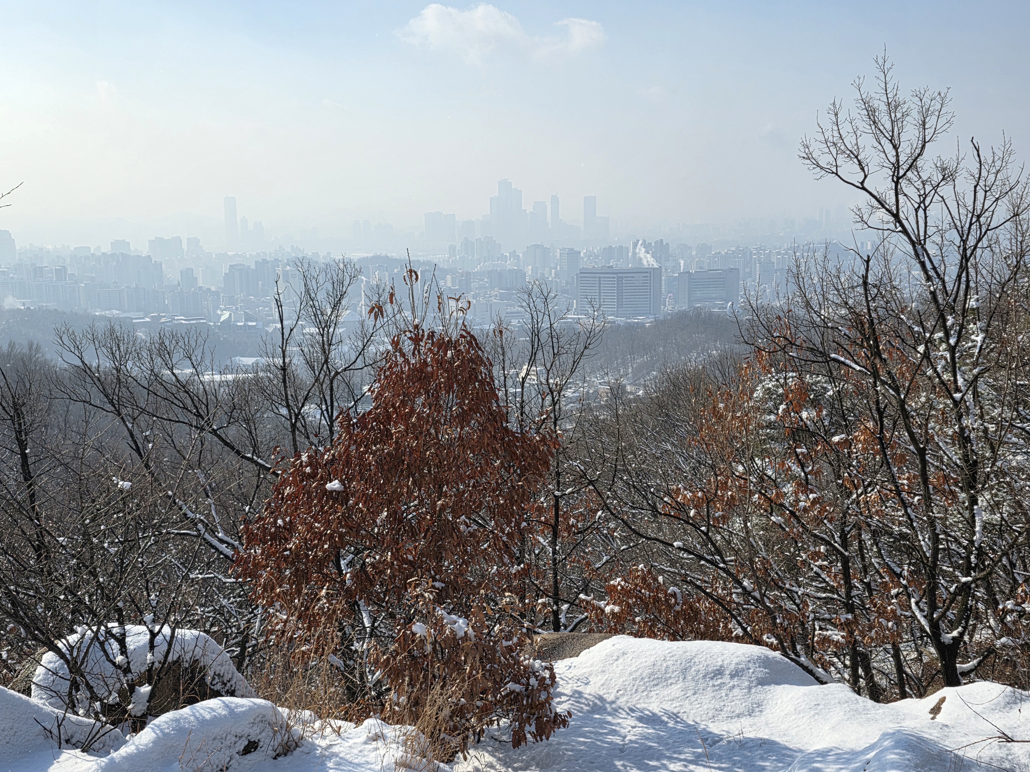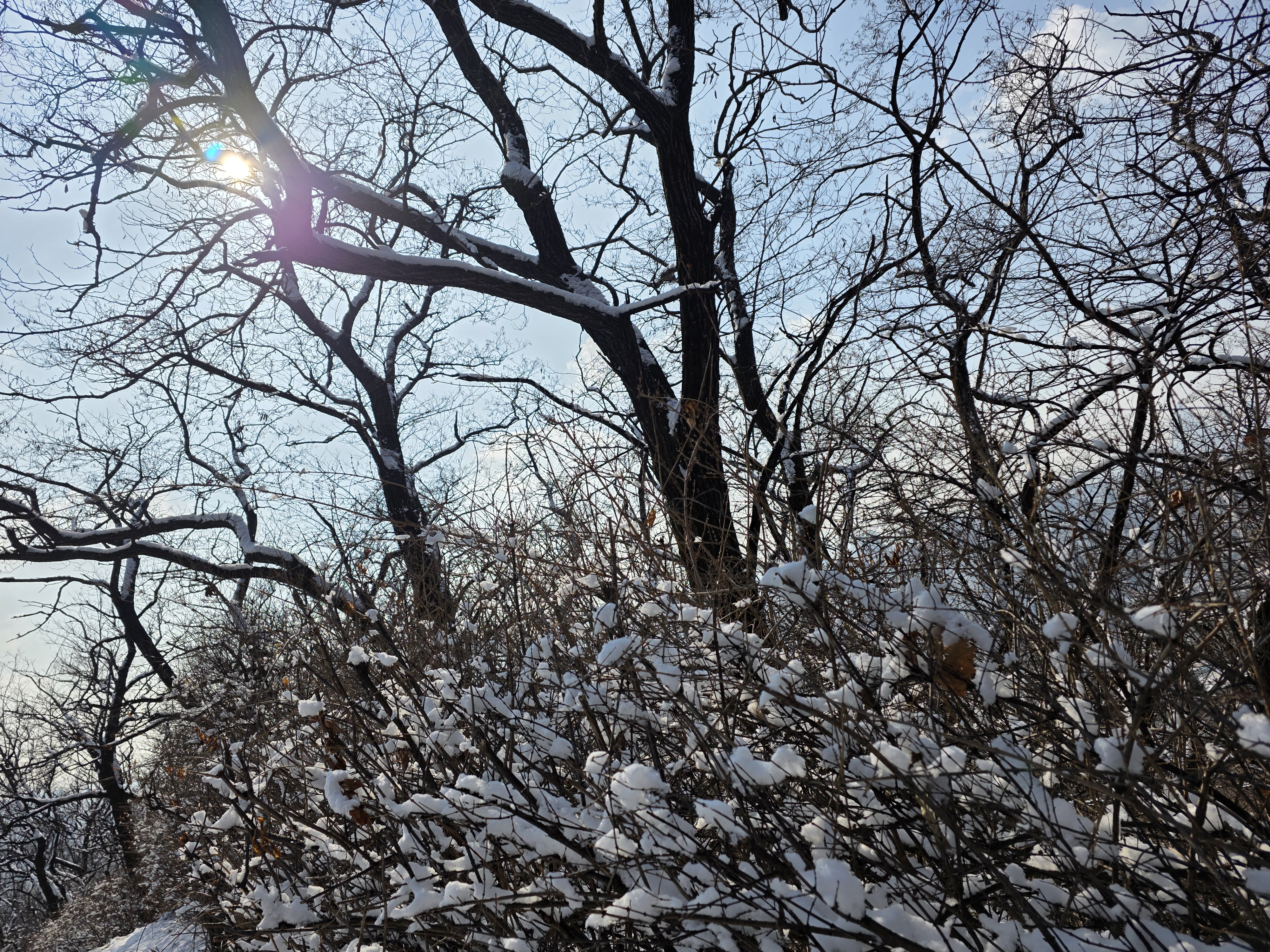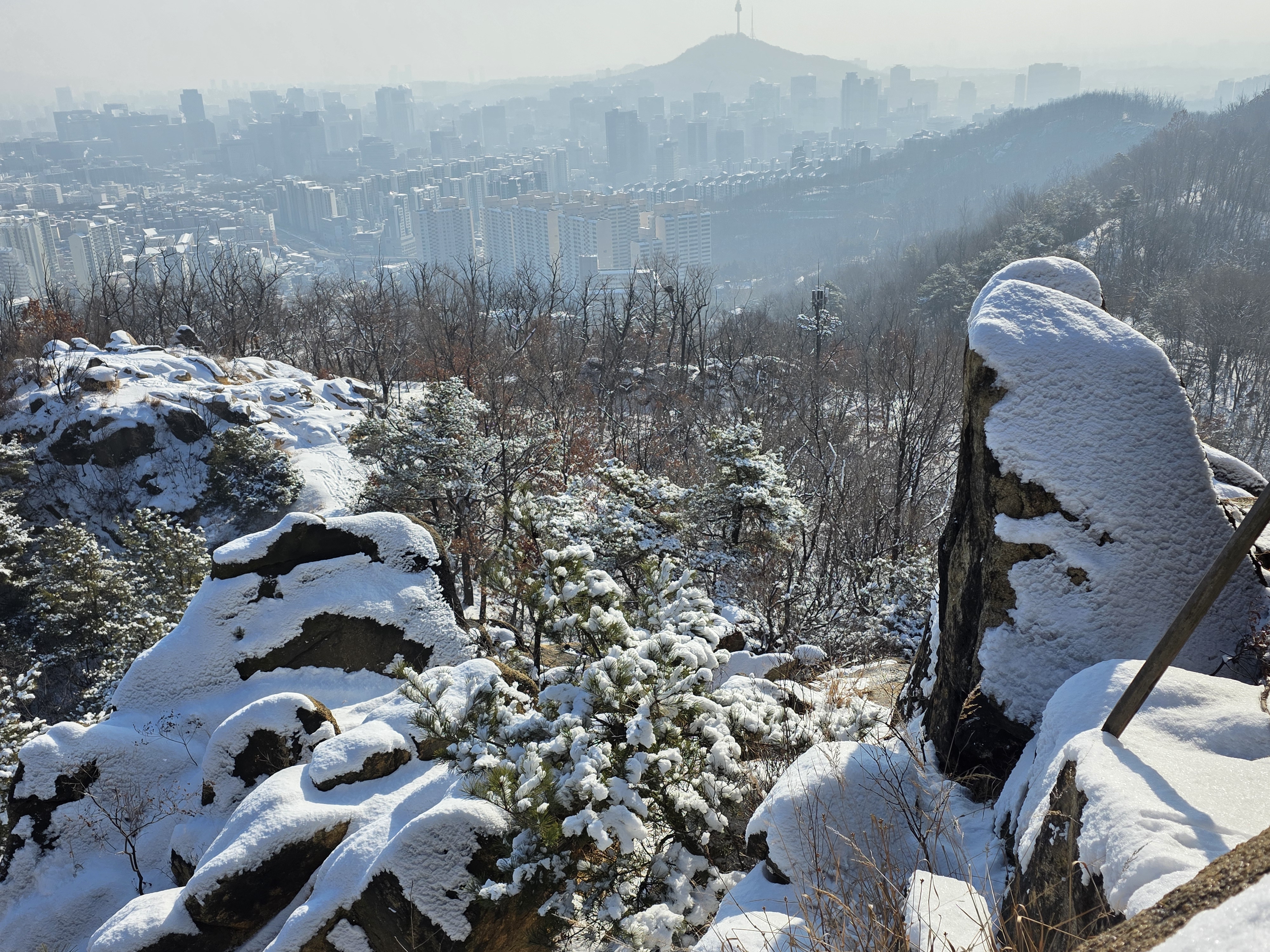 9시, 아파트 뒤 안산(鞍山) 초록숲길에 들어선다. 얼마 만에 밟는 눈길인가! 부산에 머물고 있는 내겐 눈발 보기도 어려운 귀하고 신기한 자연의 축복이다. 수복이 쌓인 눈길엔 벌써 발자국이 어지럽다. 솜털 눈발로 하얗게 성장한 누리는 아침 안개까지 드리워 서울은 몽환적인 수채화로 태어났다. 만 1년여 만에 감격하는 설국은 오르막길 숨결까지 더해 가슴을 쿵쾅쿵쾅댄다.